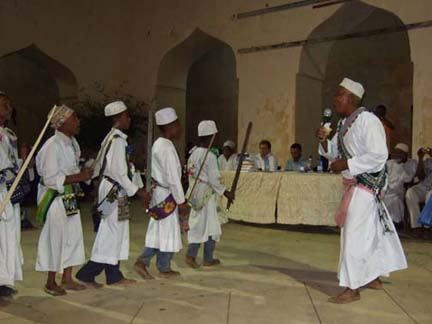 I am sitting in the lobby of Lamu House on the delightful Swahili island of Lamu, my last day after a seminar sponsored here by the Rift Valley Institute on the Horn of Africa. On Wednesday night I attended a reception given by the Lamu museum and other respected officials and members of Lamu town. The highlight of the evening was a performance in “The Fort” of the Chamba wedding dance, a slow-moving line dance with swords and sticks held steadily. On Saturday I went on a dhow trip with Captain Abu (anyone going to Lamu should ask for Abu; he is superb and knows the area well, and the Rasta man Hasan is a fantastic cook) and met Muhammad Famou Othman, head of the dance troop, who took us on a tour of his village.