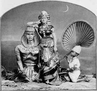 The year was 1875. As reported in The Cosmopolitan (for January, 1898), the governor of New York proposed a fund raiser for the expected visitors in the upcoming American centennial celebrations. New York City’s high society was mobilized under the direction of Mrs. Elizabeth Hamilton Cullen, granddauther of Alexander Hamilton and wife of General G. W. Cullen. Mrs. John Jacob Astor and Mrs. Belmont assisted in gathering 230 elite ladies and gentlemen to pose in various tableaux from “The Puritan Family at Prayer†to “Miss Egypt†shown here. Here is a nostalgic tidbit of vintage American Orientalism when the digs in Egypt were still very fresh. But for a nation that had only abolished slavery slightly over a decade before, it is clear that the race to end racism had only just begun.