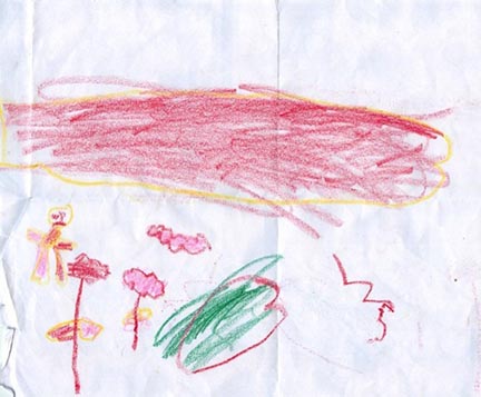 A 4-year-old girl from Homs drew this for a psychiatrist in Amman. The girl had witnessed her uncle killed by a tank, and kept repeating “Uncle, tank, blood,” according to the psychiatrist. The girl’s mother says their neighbor was raped by Syrian soldiers the same day. (Yassar Kanawati)