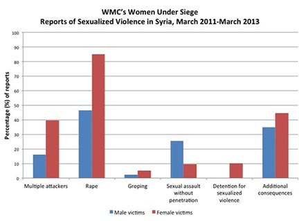 When it comes to men, more than 90 percent of the reports of sexualized violence have been allegedly perpetrated by government forces, which can perhaps be explained by the fact that most of these attacks occurred in detention facilities. Long used as a weapon against prisoners in Syria as in much of the world, rape appears to be utilized during this conflict in horrifyingly soul-crushing, creative ways. Beyond simply raping detainees, shabiha members or Syrian army soldiers have reportedly carried out the rapes of family members or other women front of prisoners.