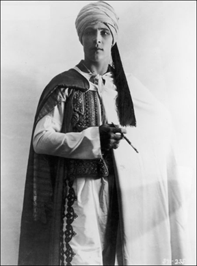 Italian-born actor Rudolph Valentino poses in costume in The Sheik.